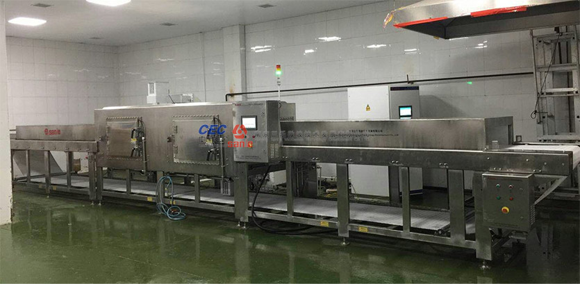 微波隧道式解凍是一種新型的、適應發(fā)展潮流的解凍方式,通過高功率密度、穿透深度深的915MHz微波穿透肉制品,解凍后顏色、營養(yǎng)成分和鮮肉相比基本無變化,連續(xù)化生產(chǎn),最大限度的降低有害菌的繁衍,是目前先進的肉制品解凍方式。